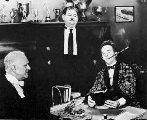 At Oxford University they suffer the customary hazing, including being given the quarters of the Dean (Wilfred Lucas) as their own, and get lost in the maze where they are chased by a ghost (another student in disguise). Among the students is a young Peter Cushing who later became a popular English movie star. Laurel is accidentally hit on the head, and a freak mental condition changes him into the reincarnation of a long-lost Oxford "great" -- Lord Paddington, a thoroughly British mental wizard and sports champion. In this state he puts the other students to shame and makes Hardy his personal lackey. Hardy finally rebels, and a falling window sash hits Stan on the head again, restoring him to his formal self. The humor of Laurel and Hardy during the 1920's and 30's was very much the humor of vaudeville and the music hall. Much of it was visual, physical humor. By the 1940's the trend was toward more verbal humor. The invention of sound movies was part of the cause. Compare the humor of Chaplain or W.C. Fields or Buster Keaton or Laurel & Hardy with that of Cary Grant or Robert Benchley. At least in the early L&H; films sound was not essential to understanding the humor. Not so with the later comics of the 1940's. Although A Chump At Oxford has many good scenes, the film as a whole is loosely organized, not up to the standards of their earlier features. Comedy in the 1940's was leaning away from sight comedy and physical comedy. >>Top of Page | Return to Films Index